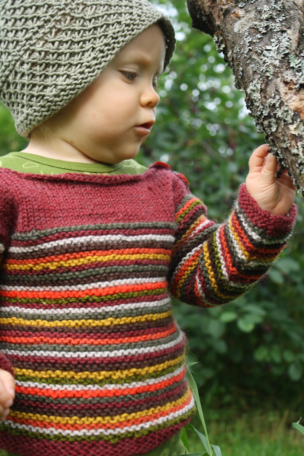 Voi kuinka kaunis villapaita sekä sen kantaja :) Meidän pihalla kasvaa kääpiöomppupuu, johon tuli tänä vuonna jopa 7 omenaa. Täytyy jakaa kaikki omput tasan lapsien kesken ;)